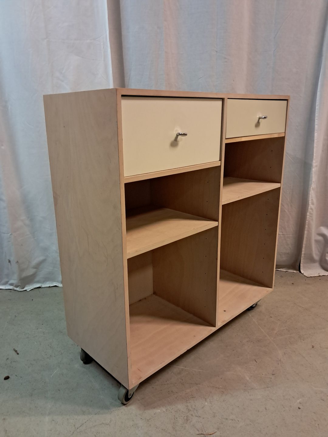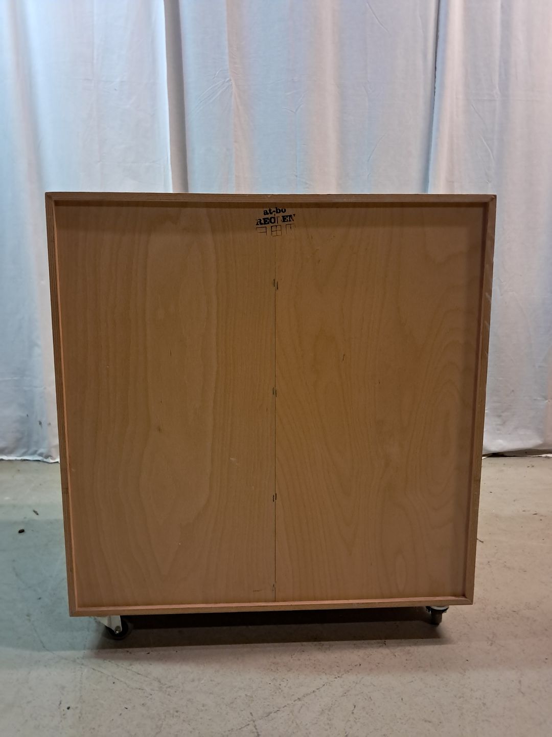 At-Bo reolkasse i birke-krydsfiner, fra 2000erne. Den har brugsspor. Højde 70cm Bredde 70cm Dybde 30cm Højde med hjul 77cm Emne nummer: 77704