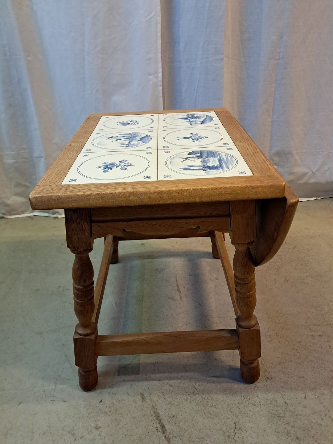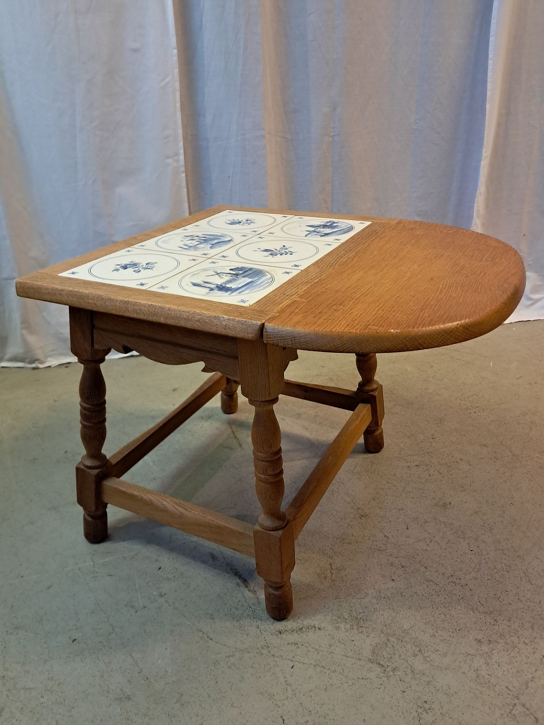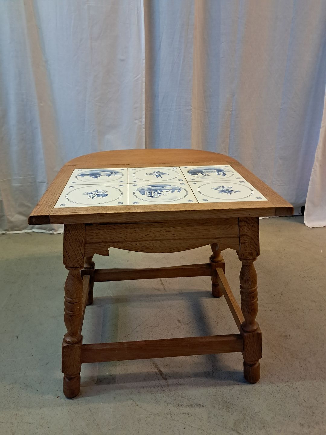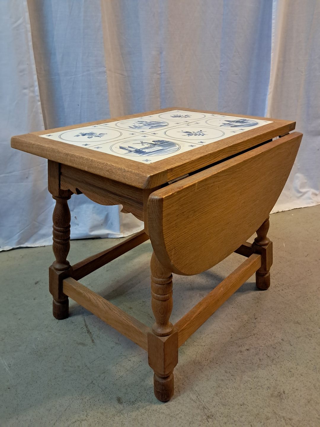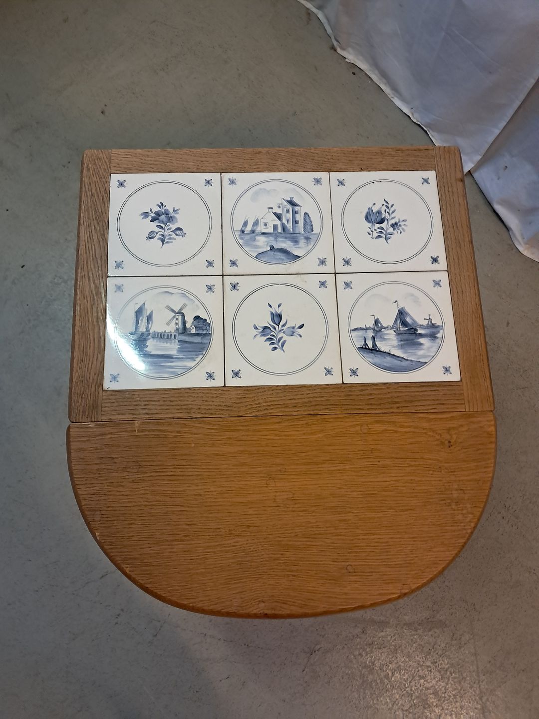 Lille bord i massivt egetræ med kakler og en klap, fra 1980erne. Det har brugsspor. Højde 49cm Bredde 55cm Længde 38cm Længde med klap 69cm Emne nummer: 77766