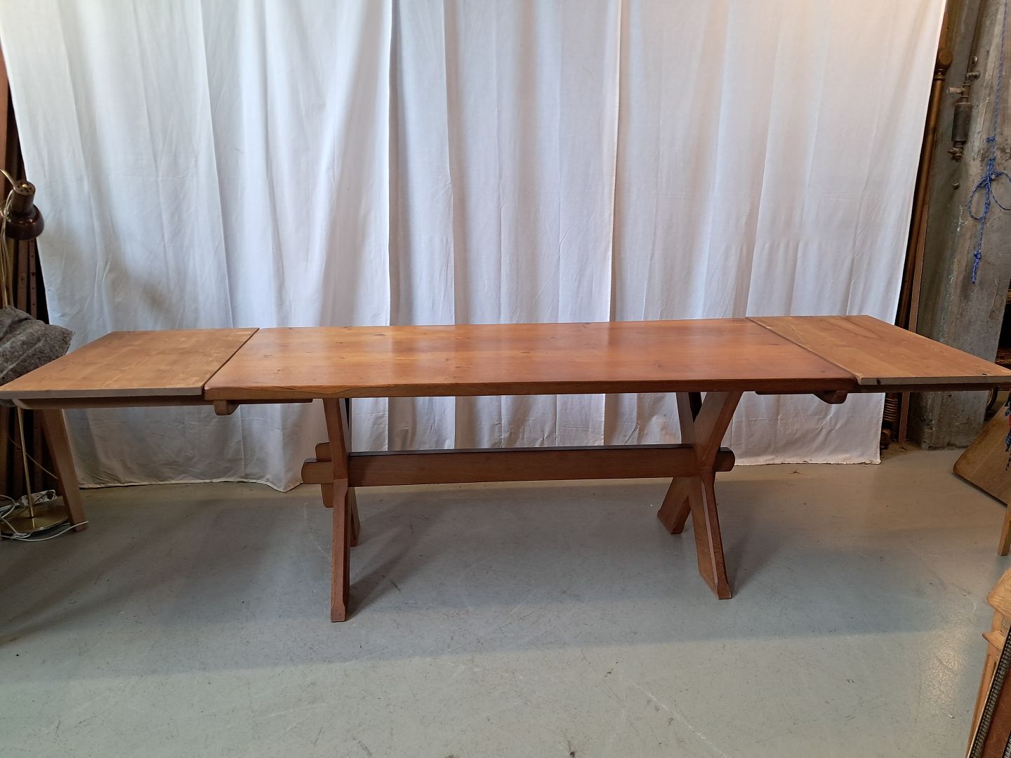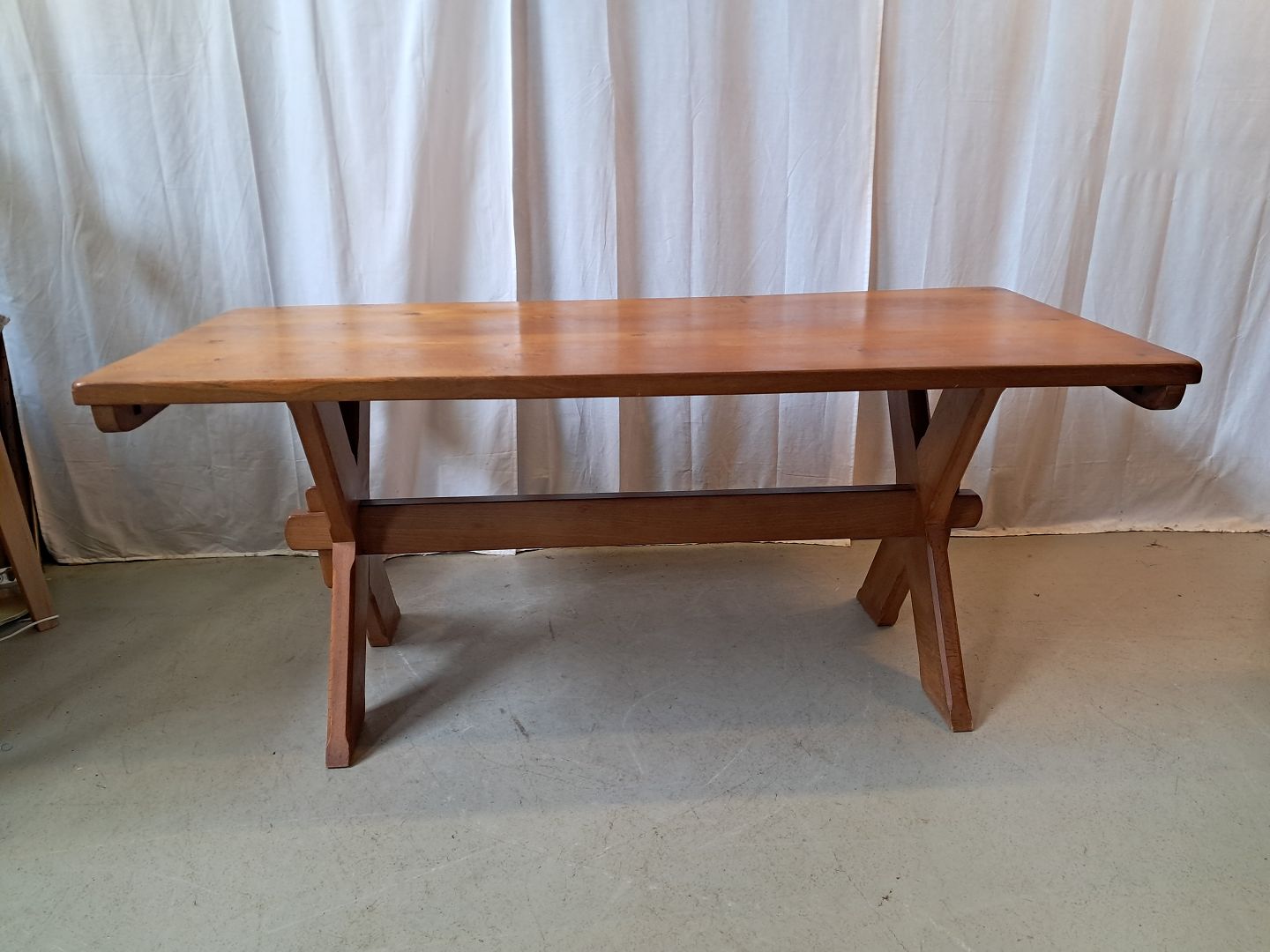 Plankebord i massivt egetræ med 2 tillægsplader, fra 1980erne. Det har brugsspor. Højde 75cm Bredde 81cm Længde 179cm Længde med tillægsplader 276cm Emne nummer: 77789