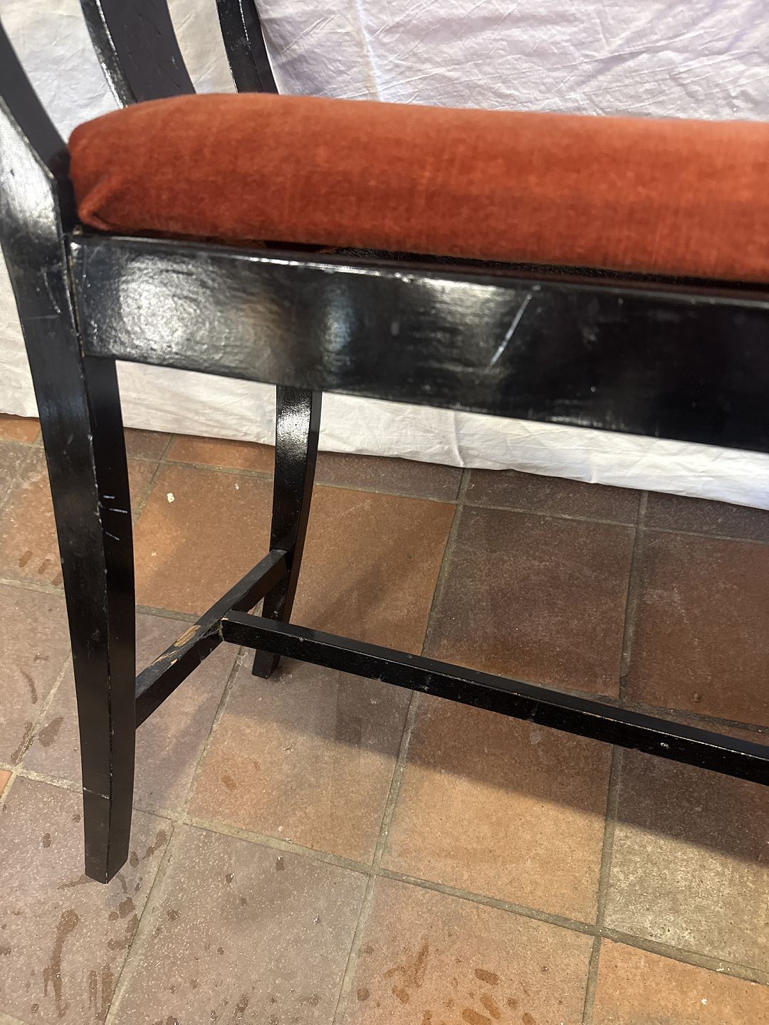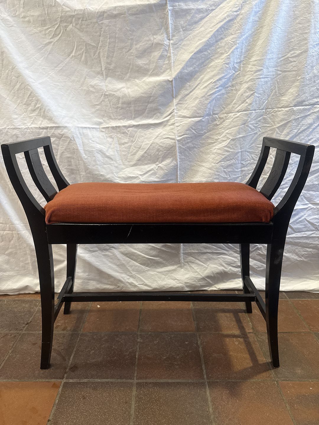 Klaverbænk i sortlakeret træ betrukket m. rødt velour stof. Udført ca. 1930'erne. Brugt stand, fremstår med lak afslag. Mål: H. 65 cm. B. 72 cm. D. 29 cm. SH. 51 cm. Emne nummer: 81068