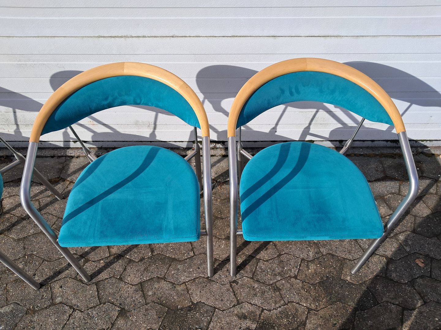 4 Chairman stole af Henrik Tengler i metal med turkis stofbetræk, fra 2000erne. De har brugsspor. Ryghøjde 76cm Sædehøjde 44cm Emne nummer: 77925