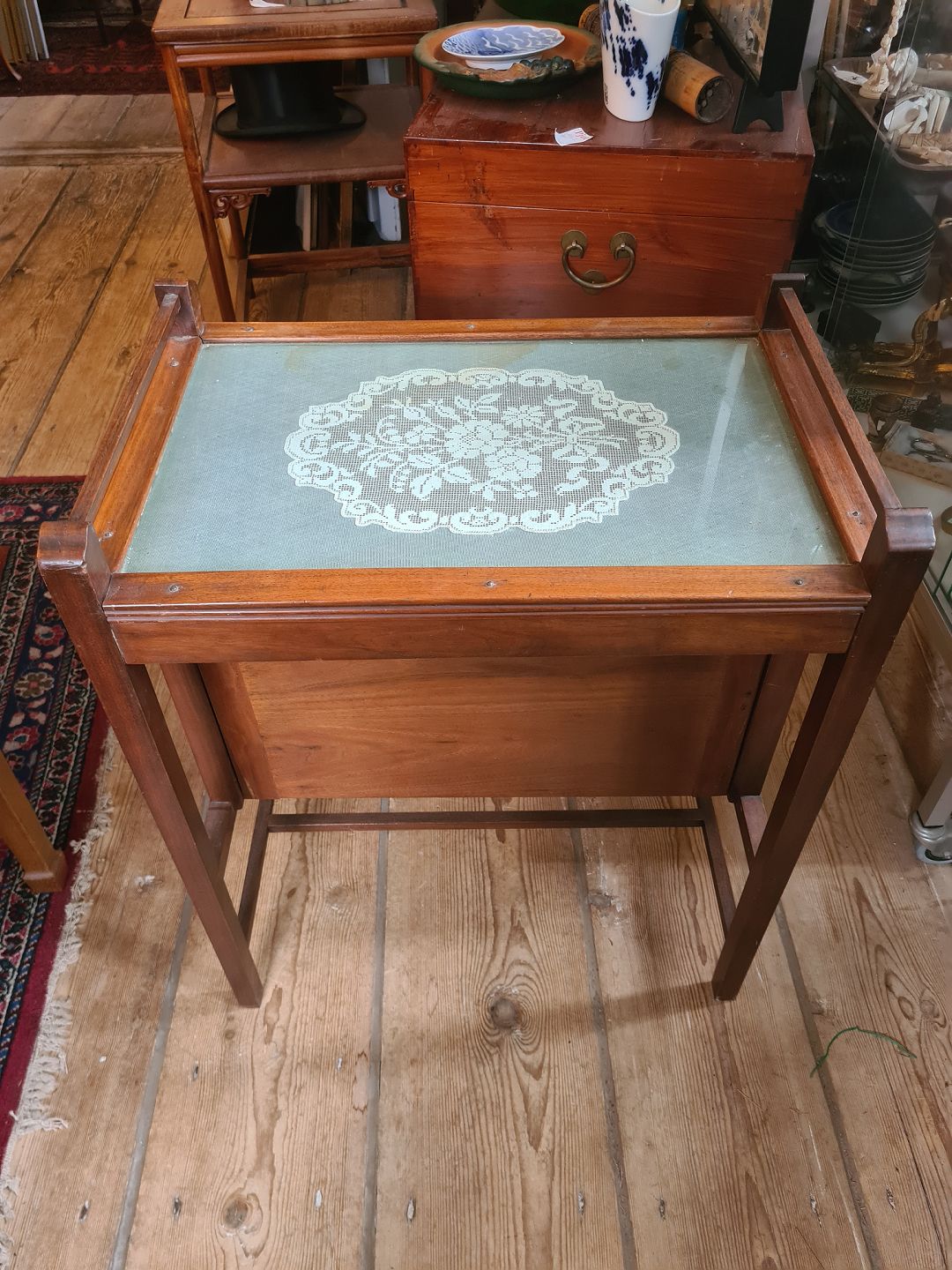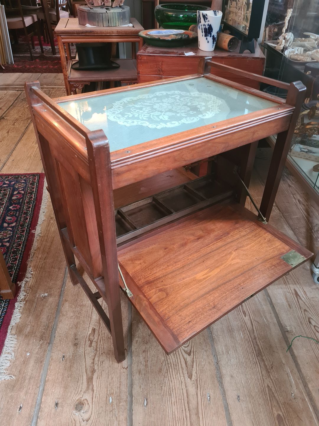 Lampebord fra 1930'erne i mahogni med glasplade og bar rum. Fremstår pænt velholdt og funktionsdygtigt, med kun en anelse brugsspor på broderiet under glaspladen. Højde 75 cm. Længde 60 cm. Bredde 40 cm. Emne nummer: 81038