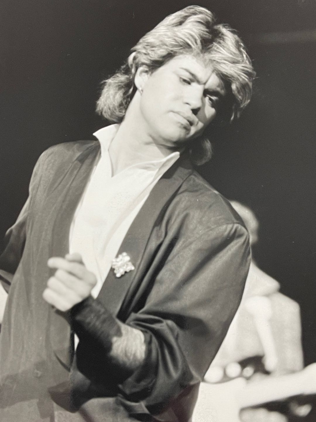 Original black and white press photo of George Michael of Wham during the latter's tour of China in 1985. Photographer: Neal Preston.