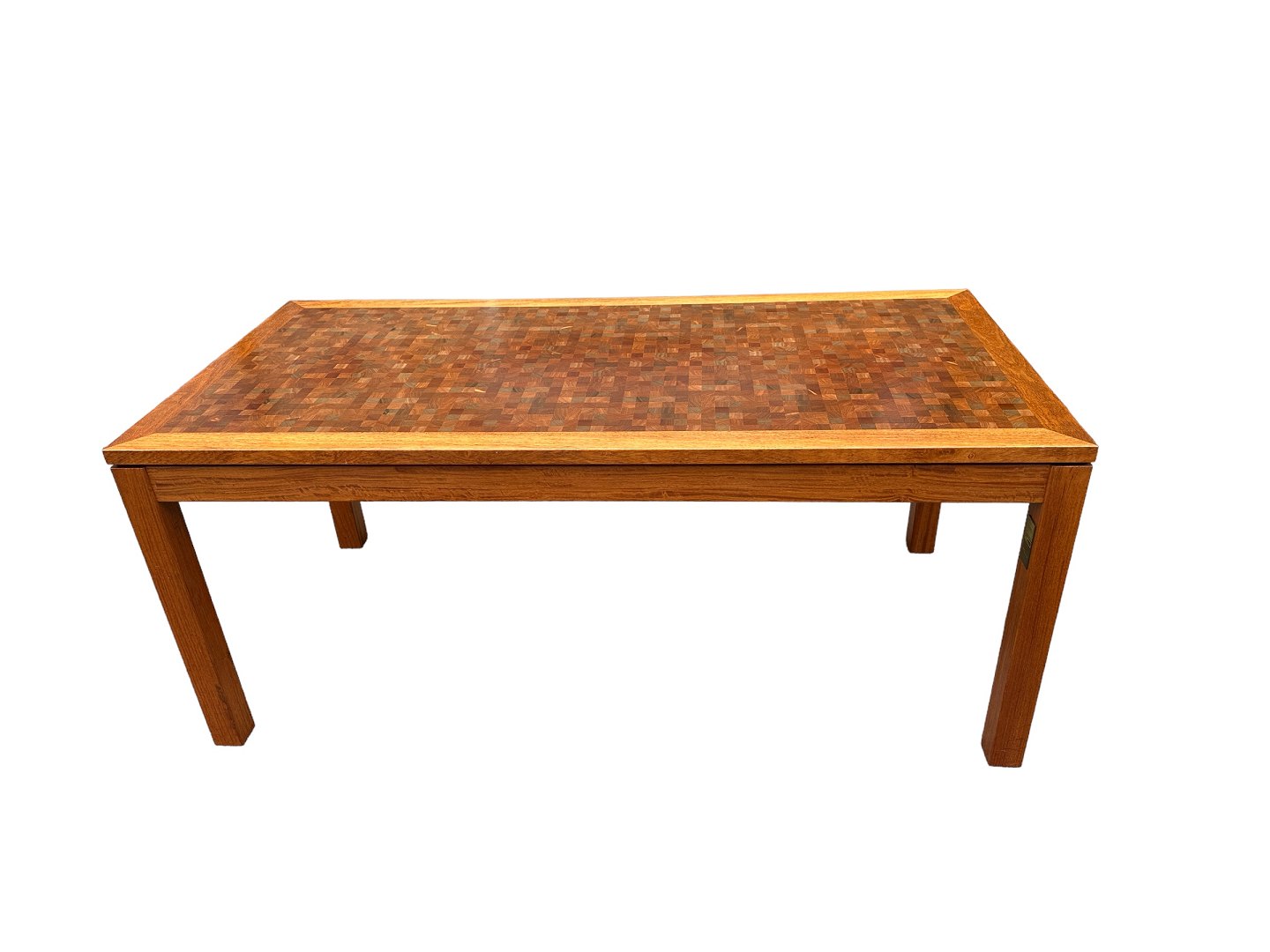 Dansk design sofabord fra Tranekær Denmark. Designet af Rolf Middelboe, Arkitekt: Gorm Lindum. Massiv mahogni, pladen indlagt med mosaikker af forskellige træsorter.