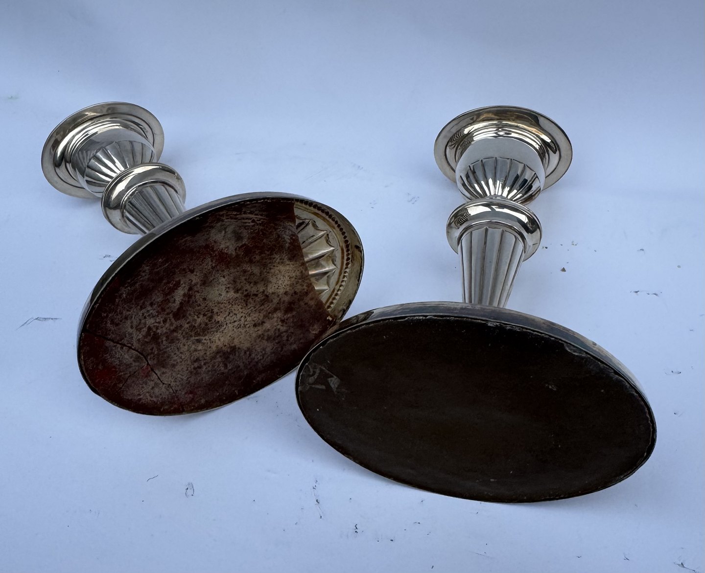 Par lysestager i sølvplet designet af Svend Toksværd. I god stand uden skader eller reparationer. Almindelig brugsspor på overfladen. Signeret Sv. T. Højde: 17 cm