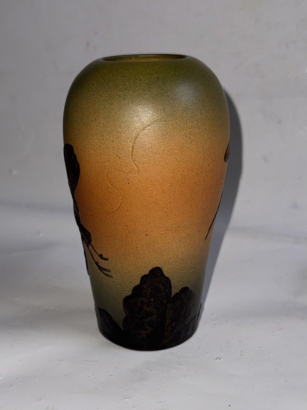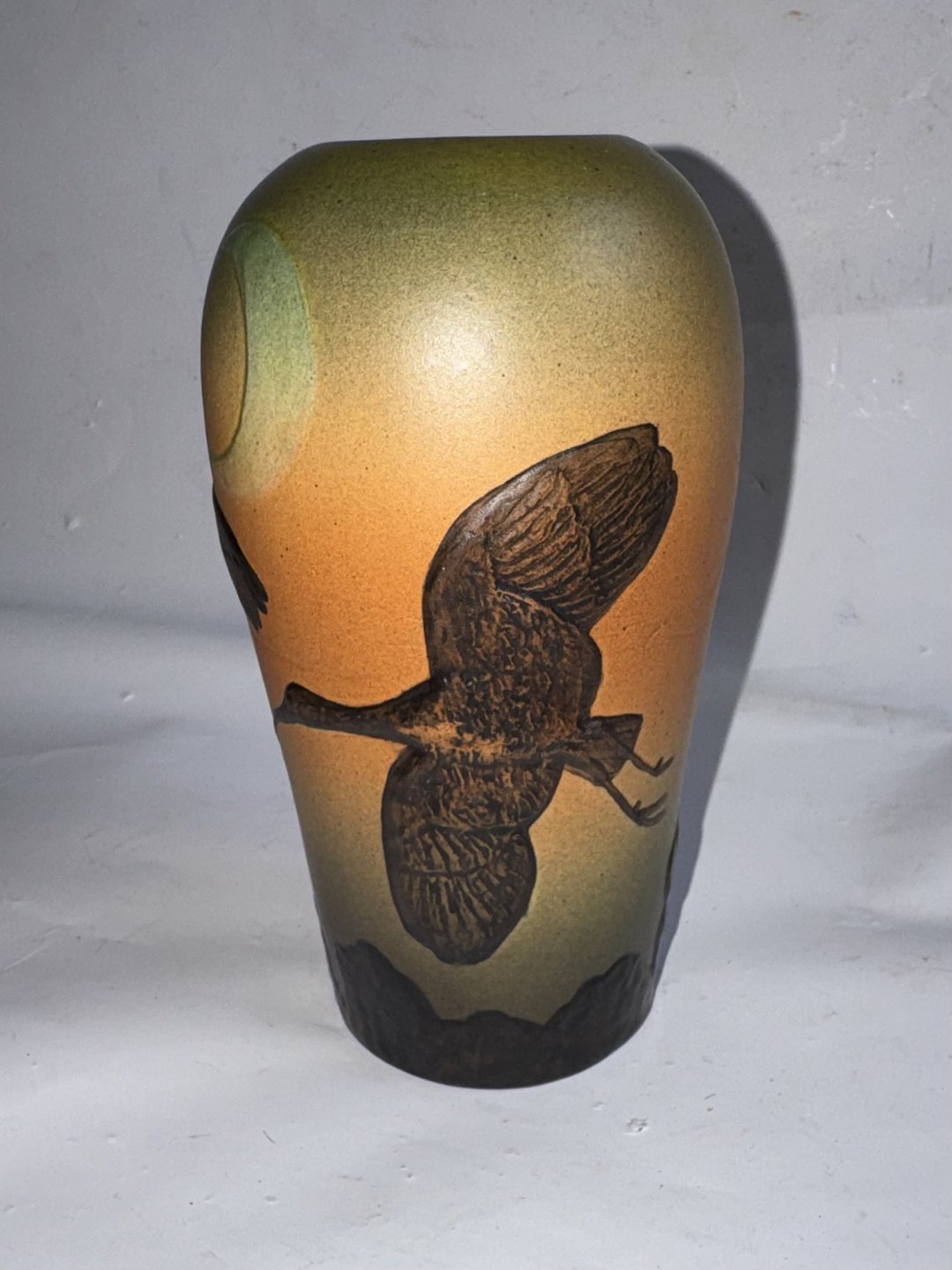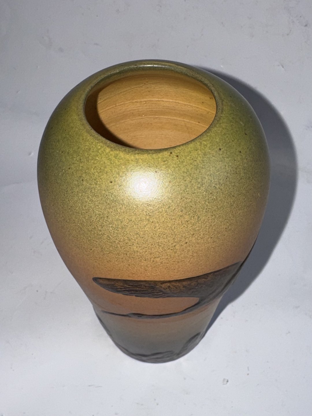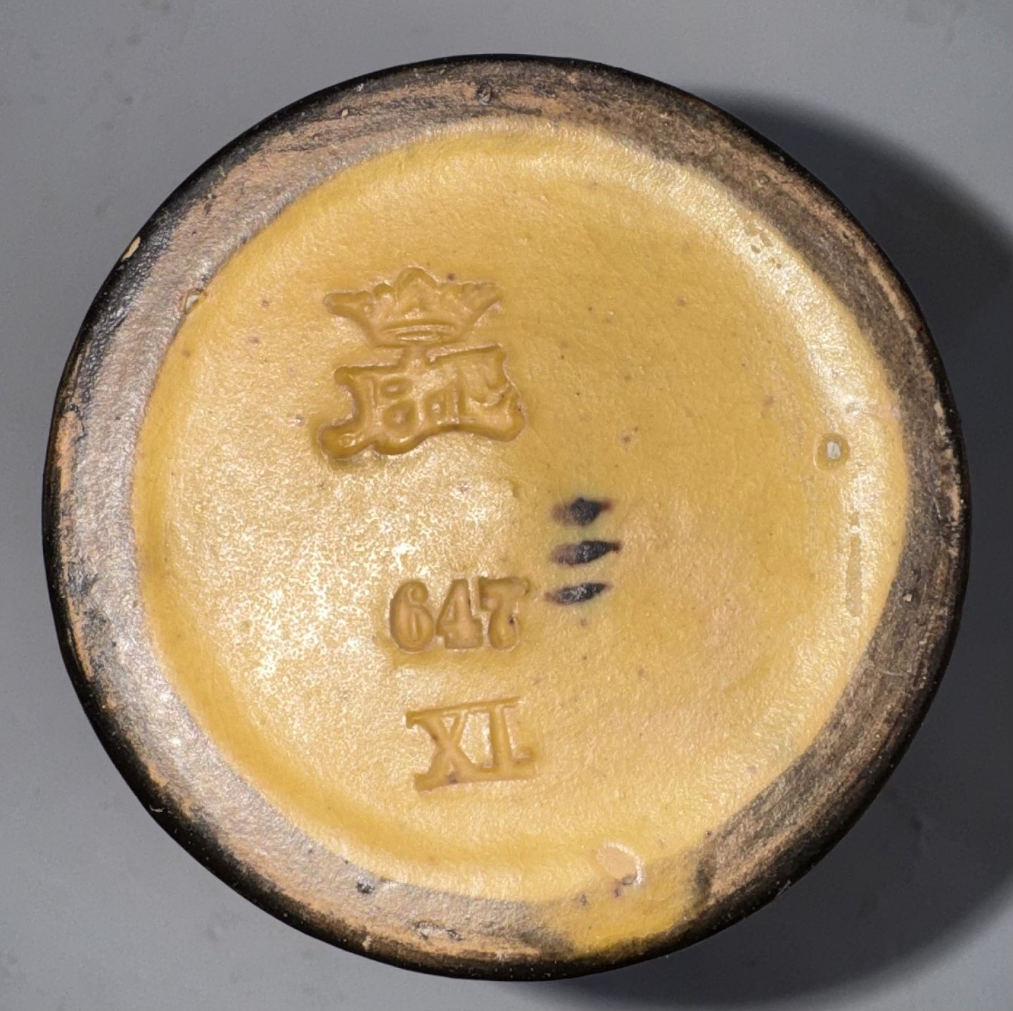 Ceramic vase from the Copenhagen pottery factory Peter Ipsen, circa 1925. Decorated with a large flying bird. In good condition. Small “needle mark” on the edge of the base (see photo). Factory mark on the base with P. Ipsen Enke logo (crown over PIE) and model number 647. H. 14.7 cm.