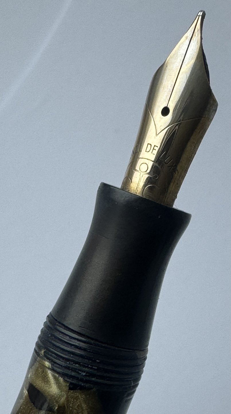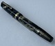 Grøn marmoreret Penol de Luxe fyldepen. Produceret på chr. Olsens fabrikker i København omkring 1945. Push button filler. Der skal indsættes en ny gummisæk før den igen kan optage blæk og skrive igen. Ny gummisæk kan indsættes for et tillæg på kr. 250,- Alle dele originale til denne model. Ingen skader eller reparationer. Lette almindelige brugsspor på overfladen. Længde 12,5 cm