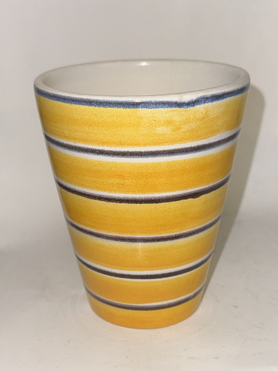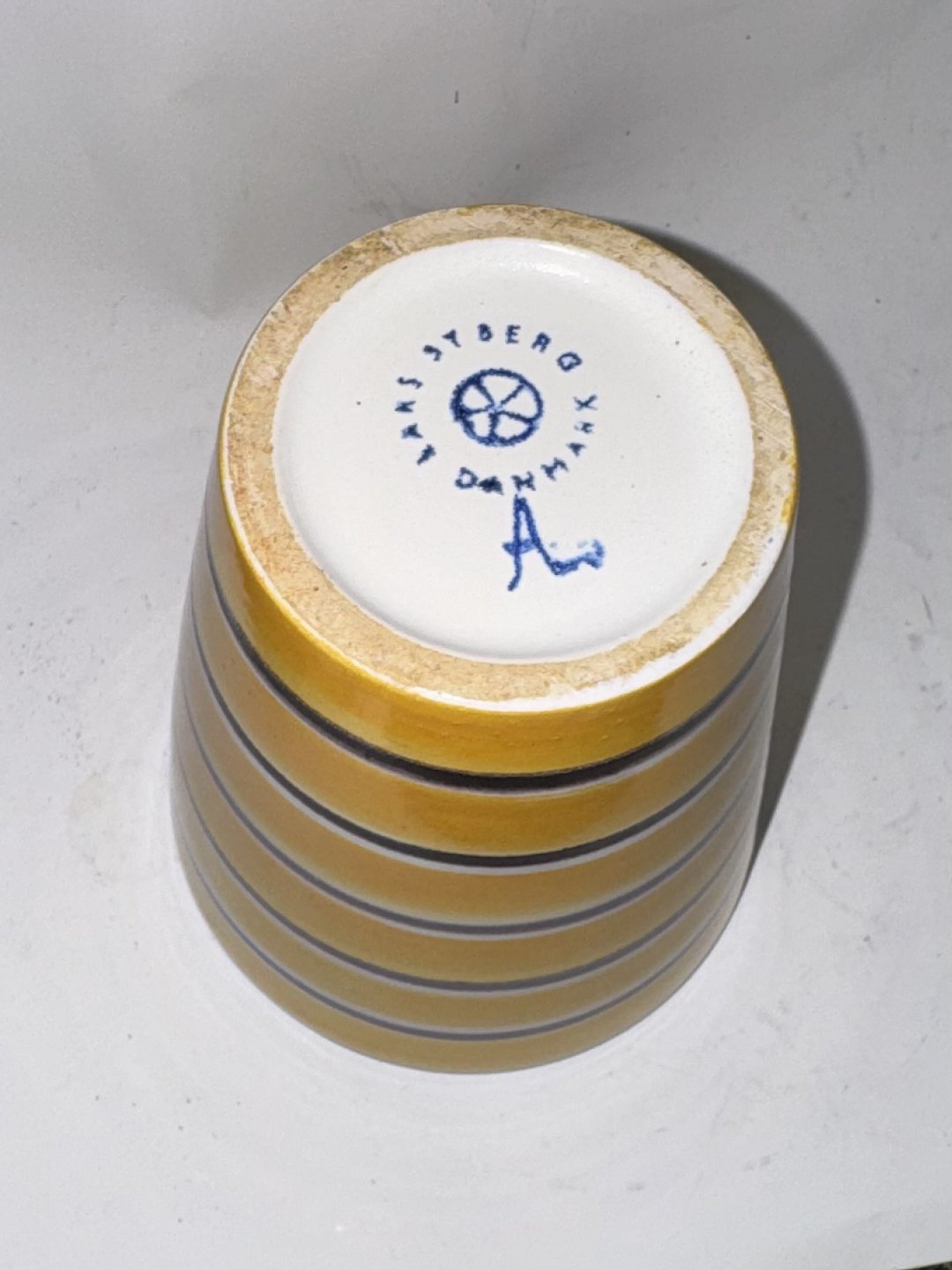 GUL MED STRIBER: Bæger eller vase i keramik fra Lars Syberg fabrikken. Formodes fremstillet i 1960’erne. I god stand. Fabriksmærket på bunden. Mål: 12,3 cm Ø. 9,8 cm