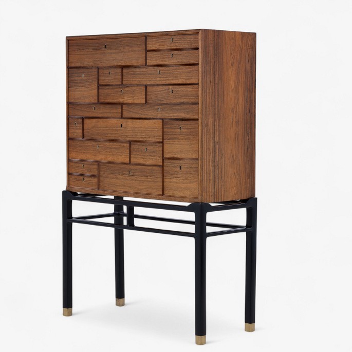 Sjældent skab i palisander med skuffer og sortlakeret stel med messingsko.
