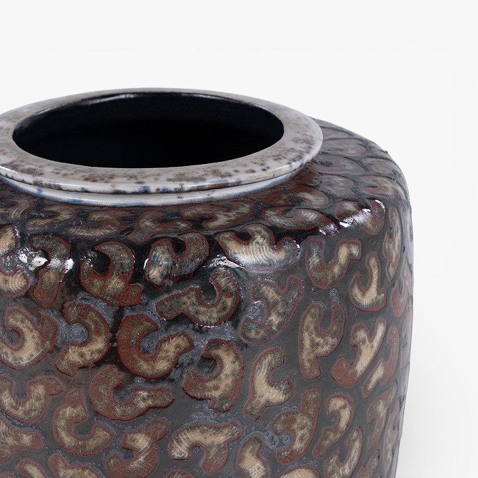 Kolossal krukke i stentøj med sort glasur og røde stafferinger. Signeret.