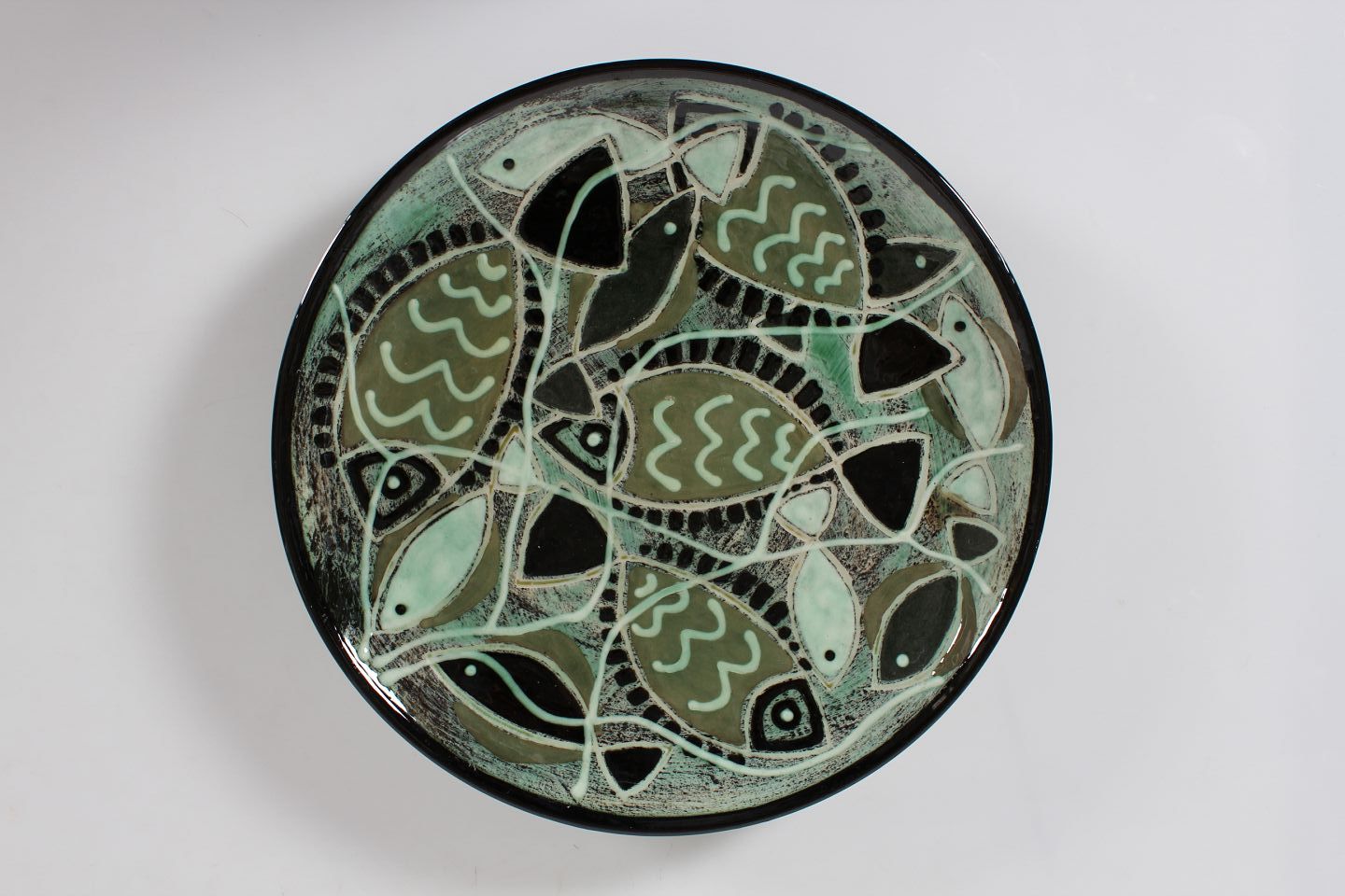 Stort cirkulært keramik fad med fiske dekoration