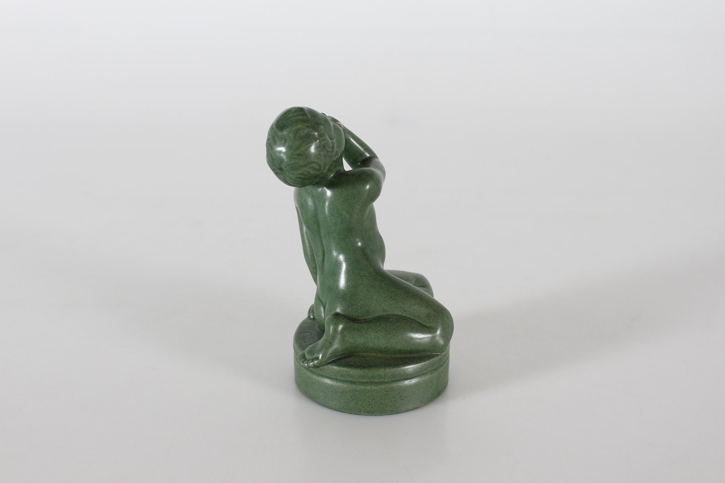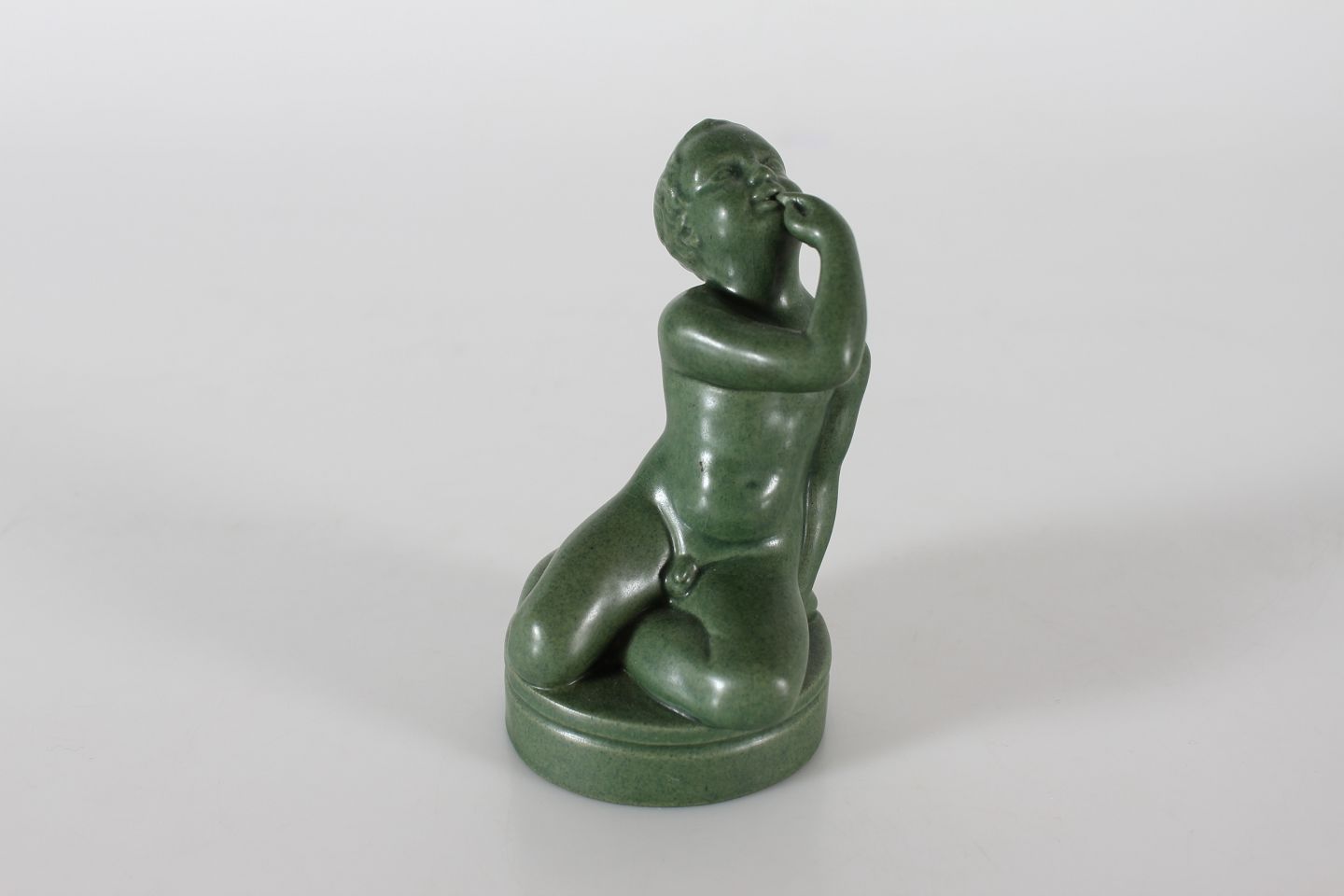 Ipsens Enke Figur nr. 862 af siddende dreng formgjort af Axel Sørensen Fremstillet af keramik dekoreret med jadegrøn glasur Sign: Ipsens Enke + 862 + Denmark Højde 12 cm Fin fejlfri stand