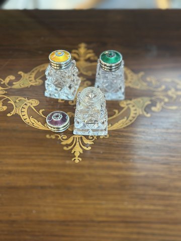 Saltbøsse i krystal , sterling sølv top med emalje ,