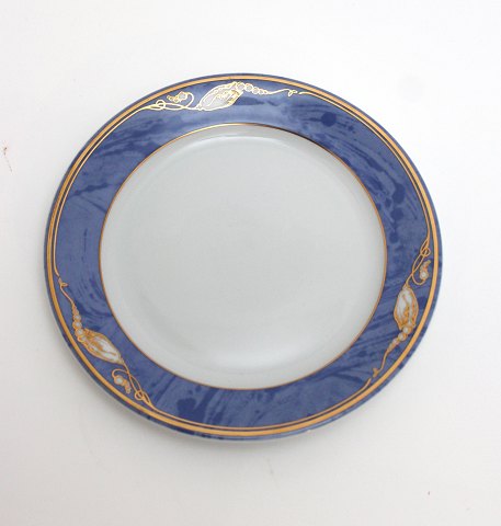 Royal Copenhagen, Blå Magnolia. Dækketallerken eller megastor middagstallerken. Blå marmoreret bort dekoreret med gylden blomsterknop. Designet af Flemming Eskildsen. Nr. 631. Diameter 31,5 cm. I. sortering. Flot stand. Pris: 300 kr. stk. Lager: 16
