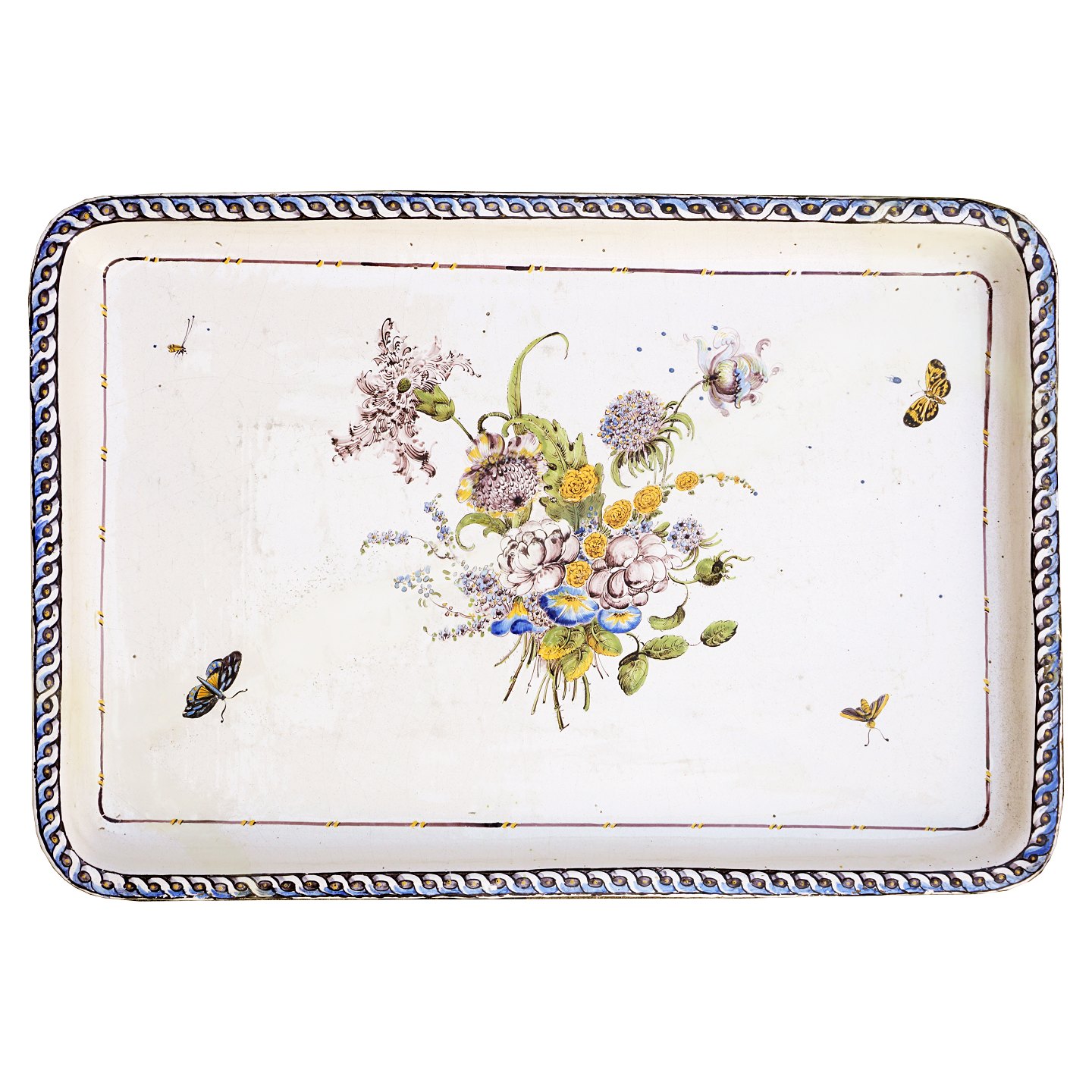 Polychrome decorated faience tray top table, Louis XVI Marieberg, Stockholm, circa 1770 H: 74cm. Tray: 61x88cm Item number: 34337