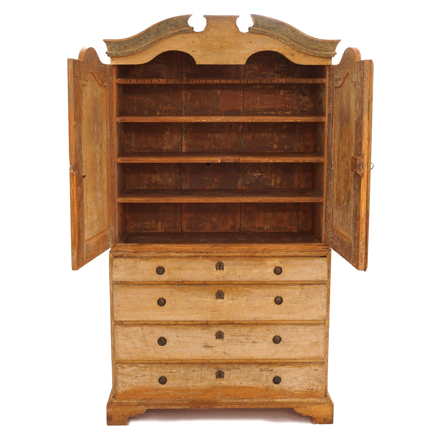 A light yellow and blue/green decorated Baroque cabinet. Sweden circa 1750. H: 220cm. W: 124cm. D: 47cm
