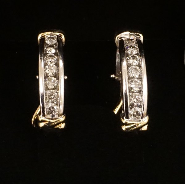A pair of 14kt gold creole half paved earrings. Each with a diamond of circa 0,1ct Size: 2,8x0,5x1,4cm Item number: 34530 B