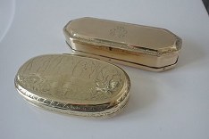 2 tobaksdåser i messing. Den ovale dåse i forgrunden er solgt.