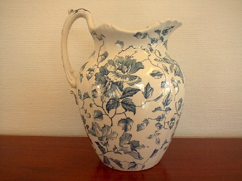 Aluminia Servantesæt. Har ALUMINIA indpresset i glasuren. Kanden måler 29,5 cm. i højden. Fadet måler 40 cm. i diameter og 12 cm. i højden.