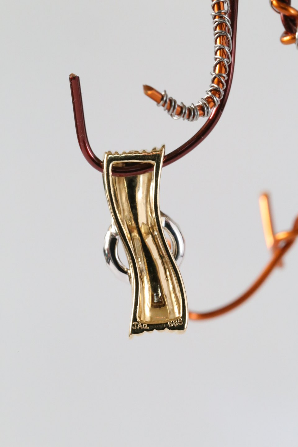 This pendant has many beautiful details. The curved shape gives the pendant life and the combination with the wreath of brilliants in the middle makes this pendant something very special. It will be beautiful in a thin gold chain, where its shape and dynamics can really come into their own.