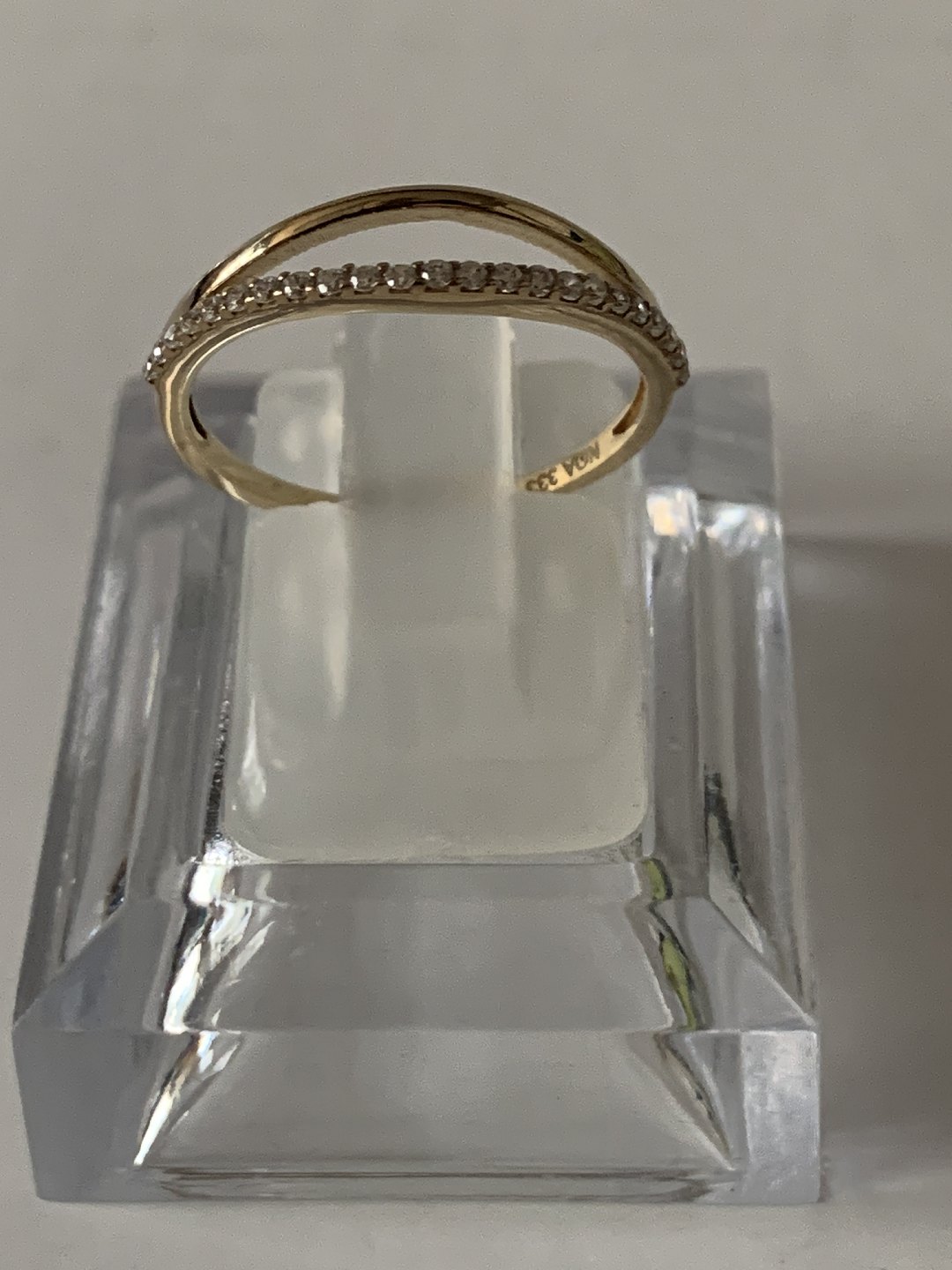 Fin damering i 8 karat guld med hvide sten. Ringen har et smukt og enkelt design, der gør ringen enkel på fingeren. Samtidig giver den kløvede top, et flot og dynamisk udseende.