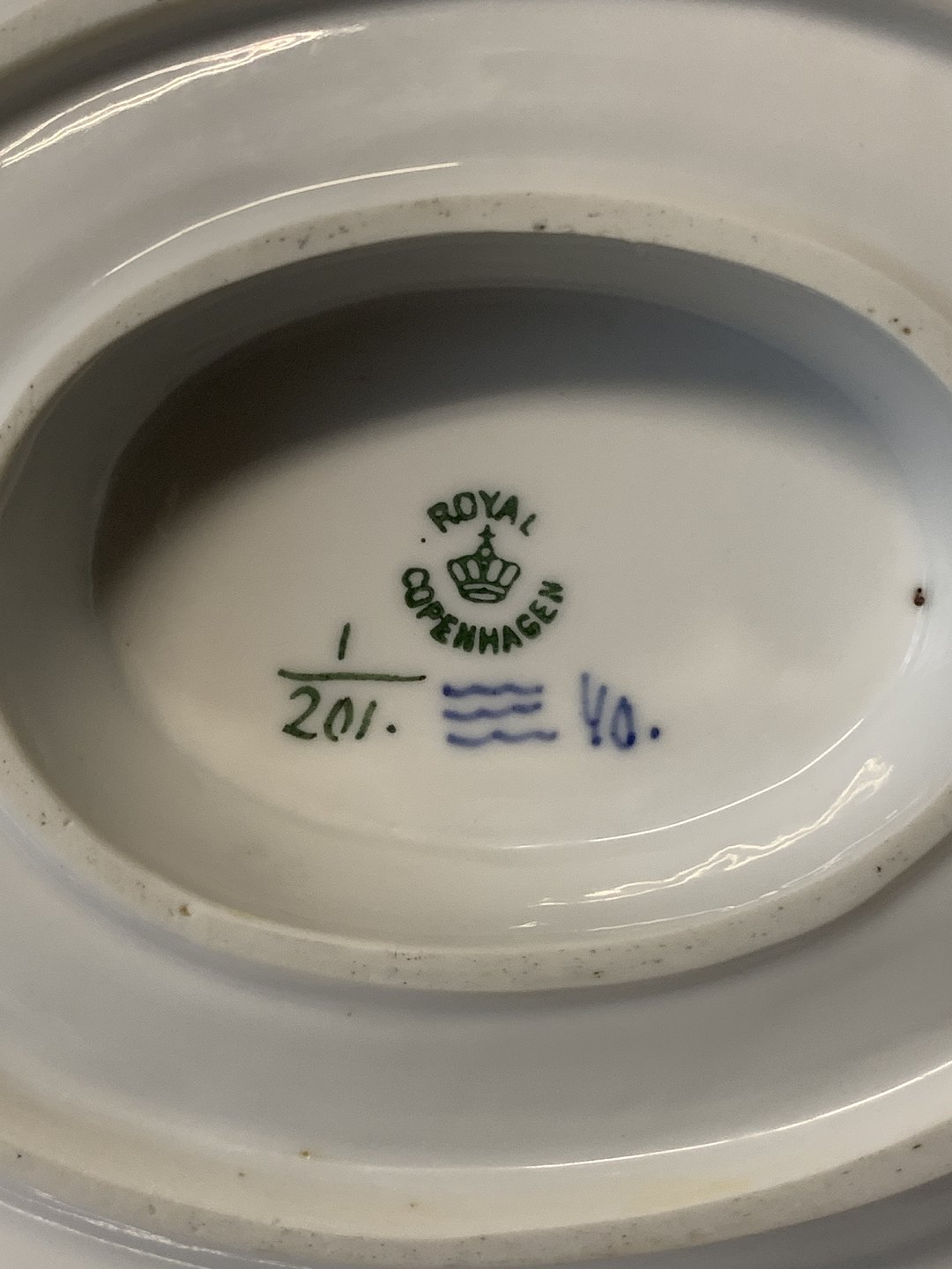 Royal Copenhagen Musselmalet Riflet sjælden sovseskål på fast underfad og med hank.