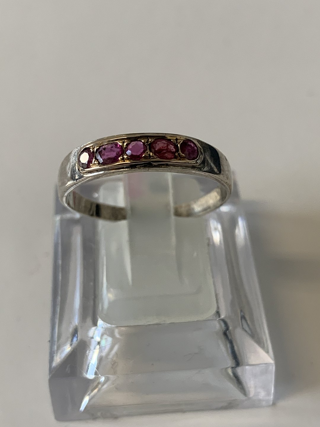 Hvidguldsring med Røde rubiner, 14 karat guld Stemplet: 585, Størrelse: 64, indvendig diameter 20,37 mm. Flot og Velholdt Stand. Varen findes ikke fysisk i butikken. Kontakt os for fremvisning