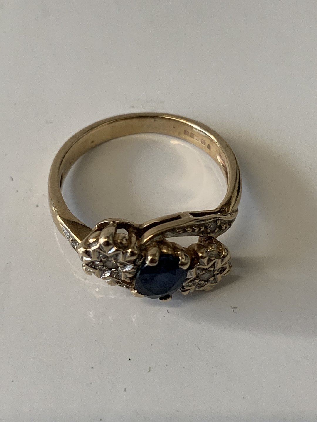 9 Karat Guldring med blå safir og brillanter Stemplet: 375, DIA Størrelse 48 / 15,58 mm. Flot og velholdt stand. Varen findes ikke fysisk i butikken, kontakt os for fremvisning