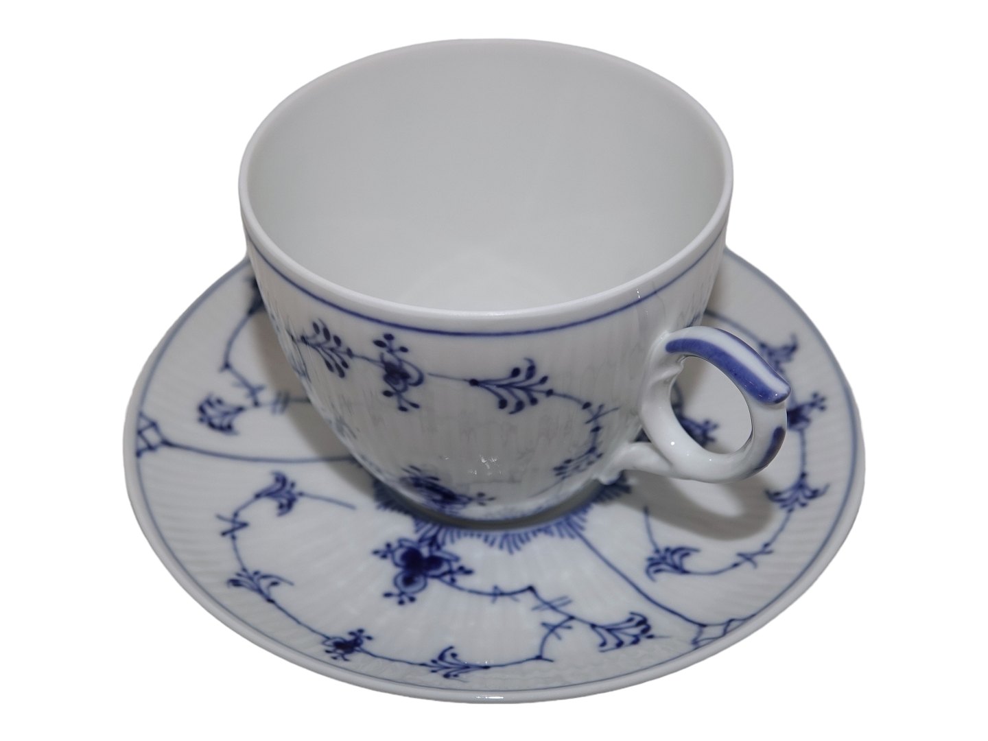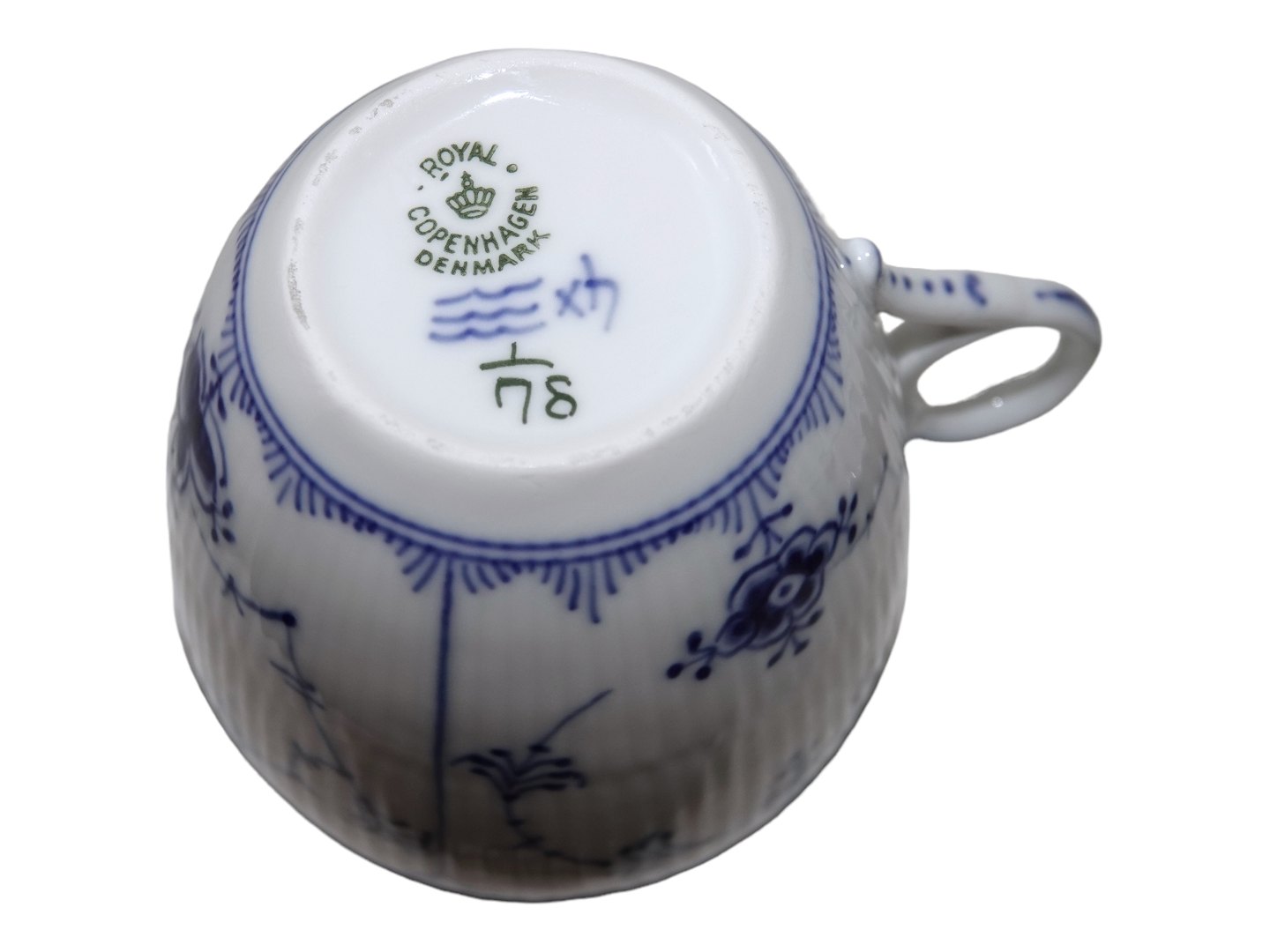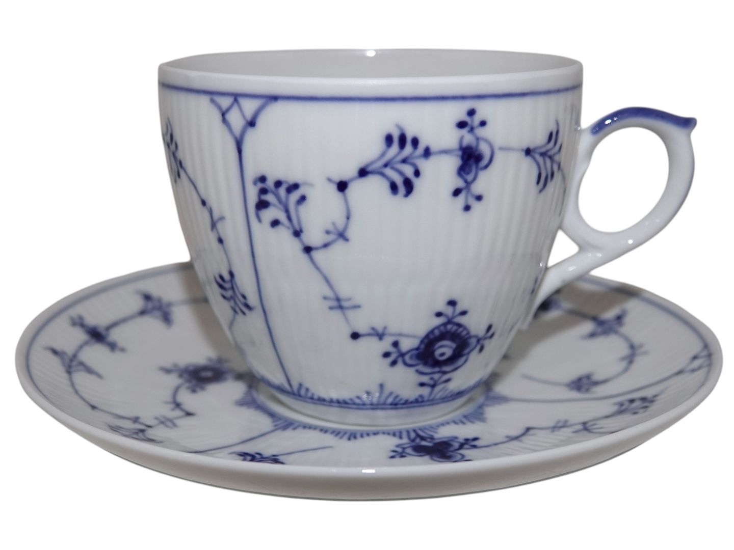 Royal Copenhagen Musselmalet Riflet, kæmpe kaffekop også kaldet en kontorkop eller morgenkop.
