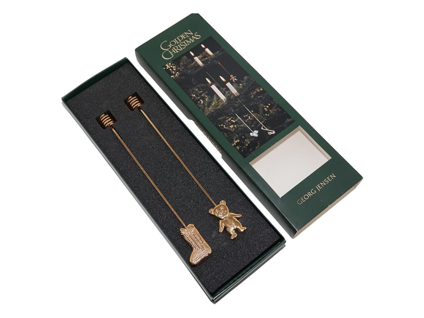 Georg Jensen Golden Christmas, pakke med to lysholdere med en julesok og bamse.