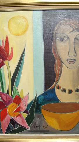 Josef José (født 1919):Kvinde ved vindue med blomster og skål.