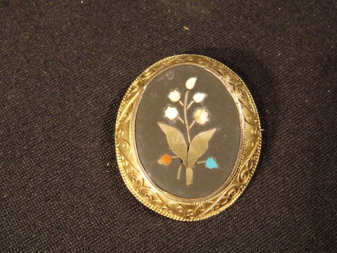 Brooch.Forgyldt.Blomster motif abolished in pietra dura mater.