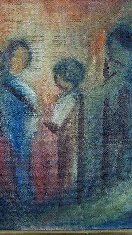 Spændende maleri af ubekendt kunstner - 3 personer i samtale.