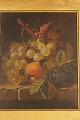 Her tilbydes et oliemaleri på plade. Smukt stilleben med frugter og hvide druer på et bord.