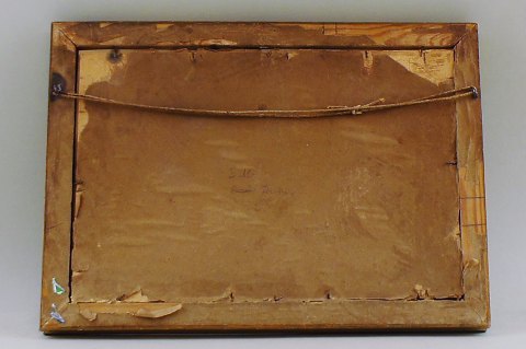 Ubekendt dansk guldaldermaler, 19. årh. Landskab med en båd på en flod. Usigneret. Olie på papir monteret på pap. 17½ x 26 cm. Påskrevet E. M. Jensen på bagsiden, for Edvard Michael JENSEN (1822-1915). I god stand, trænger til rens. Rammen er 2½ cm. bred. Udstiller