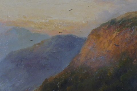 Daniel Sherrin (f. 1868, d. 1940) Skotsk landskab. Sign. D. Sherrin. Olie på lærred. 51 x 76. Rammen er 12 cm. bred. I god stand, enkelte krakkeleringer. Smuk, bred guldramme med enkelte små afslag. Priseksempel : Et maleri af Daniel Sherrin, blev solgt hos Tennants i 2003 for $ 9,381. Udstiller