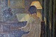 Aage Jessen, f. Vinkel ved Viborg 1876, d. 1961.Interiør med læsende kvinde ved lampens skær. Sign. Aage Jessen. Olie på lærred. 29 x 38.5. Guldrammen er 9 cm. bred.