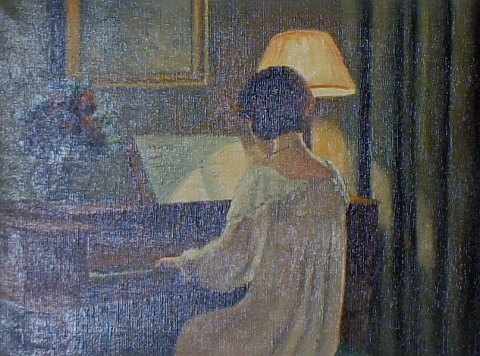 Interiør med læsende kvinde ved lampens skær. Sign. Aage Jessen. Olie på lærred.