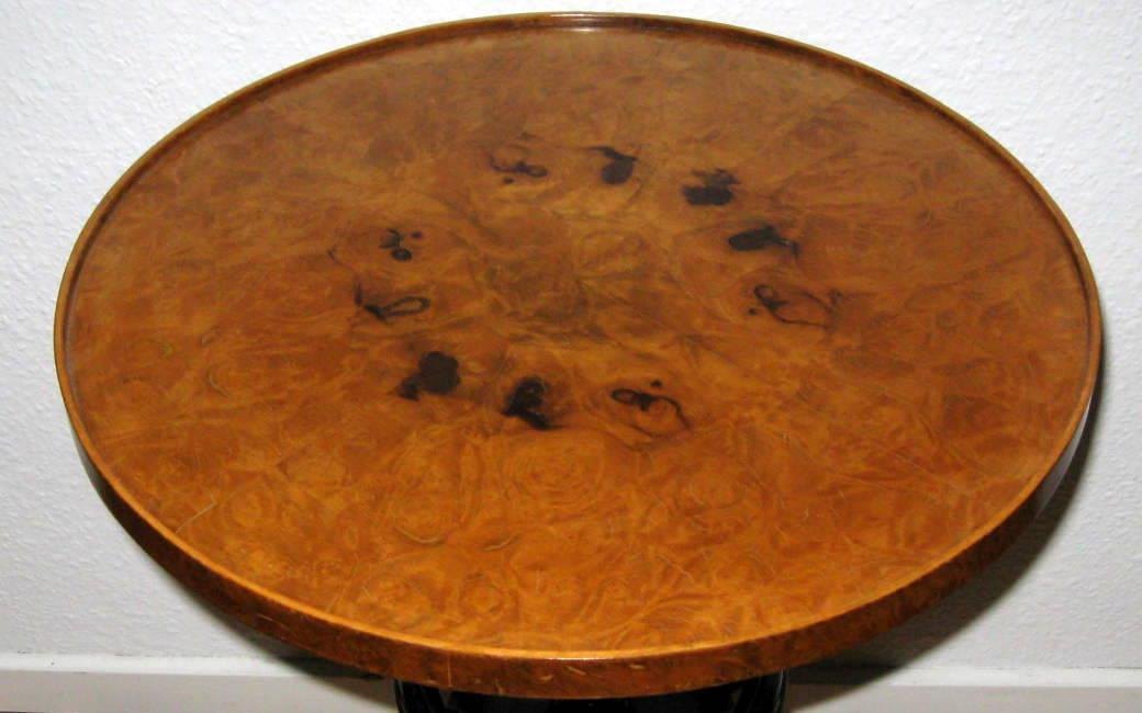 Rundt bord af birk, plade båret af sortmalet balusterformet søjle med kurv, på trepasfod. Biedermeierform. 1900-tallets slutning. H. 67,5 cm. Diam. 49 cm. Pæn stand!Emne nummer: 6270
