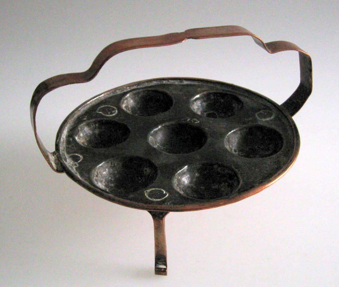Antik æbleskivepande i kobber, 1842. På trefod med hank. Til 7 æbleskiver. Indvendig fortinnet. På hanken følgende inskription: Ane Haldner 1842. Proveniens: Sønderjysk familie.Emne nummer: 6948