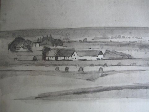 Bøggild, Mogens (1901 - 1987) Danmark: Parti fra Vesterlyng ved Havnsø. Tusch på papir. 20 x 33 cm. Signeret.: Monogram. Med lille sølvramme. Kunstneren havde sin sommerbolig ved Vesterlyng, Havnsø. Proveniens.: Familien Gianelli, Århus.Emne nummer: 4200