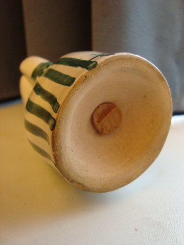 Kvindefigur i form af peberbøsse (pebermø).Glaseret lertøj med forskelligfarvet dekoration.