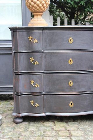 Antik barok kommode fra starten af 1800 tallet med 4 store skuffer.Kommoden er 2 delt og står med fin sort bemaling med fin patina og gamle bronze beslag.