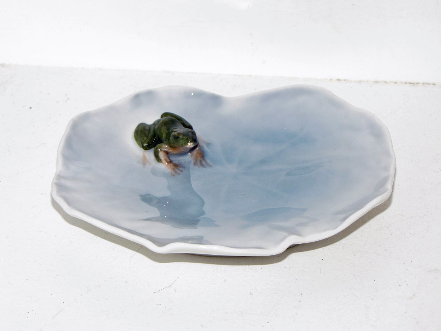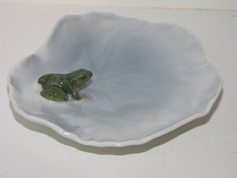 Royal Copenhagen lille skål i form af åkande med figur af grøn frø.Dekorationsnummer 2477.