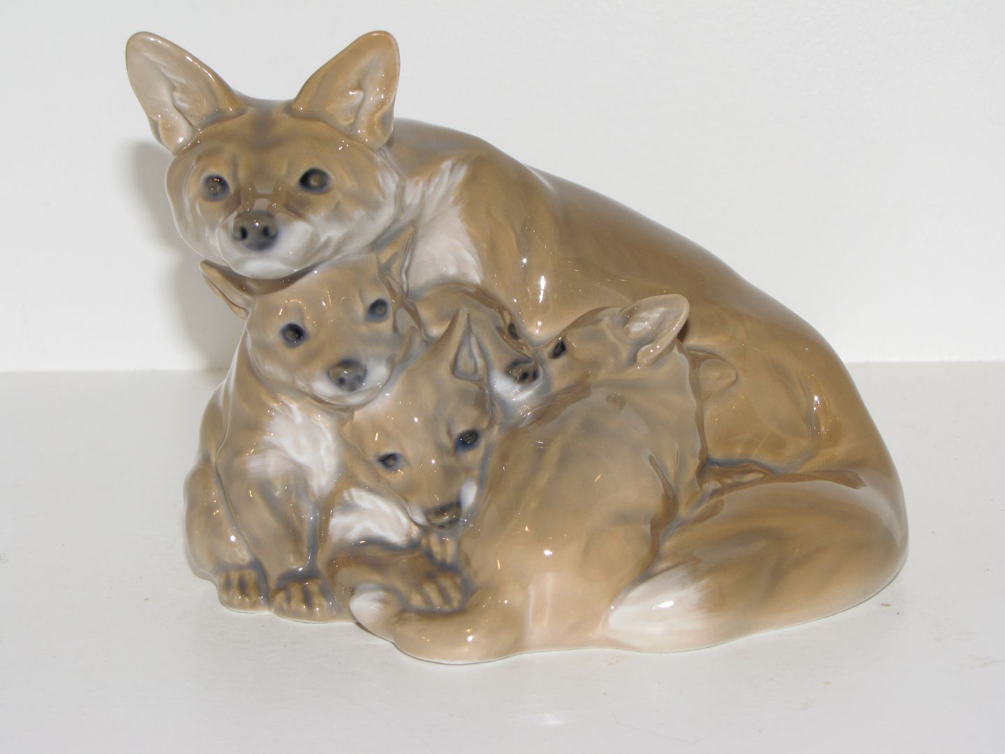 Royal Copenhagen figur, rævemor med unger.Af fabriksmærket ses det, at denne er produceret mellem 1969 og 1974.