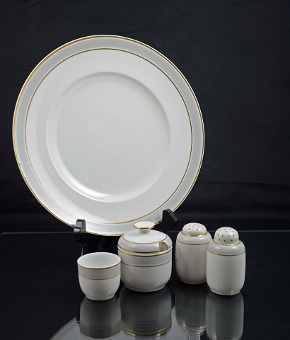 Tiber stel fra Bing og Grøndahl. Stellet har en lysegrå bort og gylden kant. Stellet er i pæn stand. Enkelte steder kan der være uregelmæssigheder i den gyldne kant.