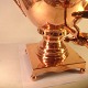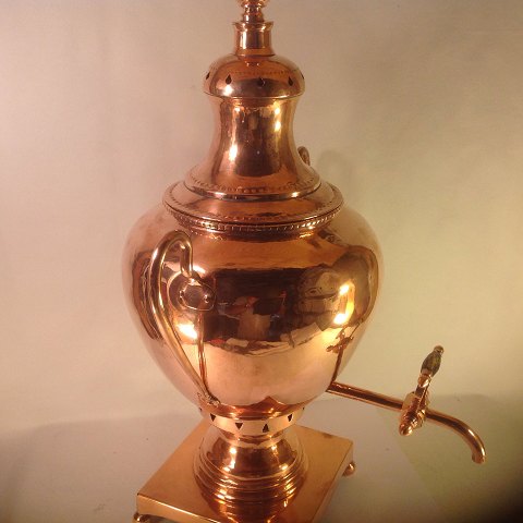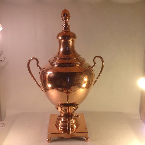 På firkantet fod med rund kobber føder. Glat korpus med sisaleringer hanke i kobber.