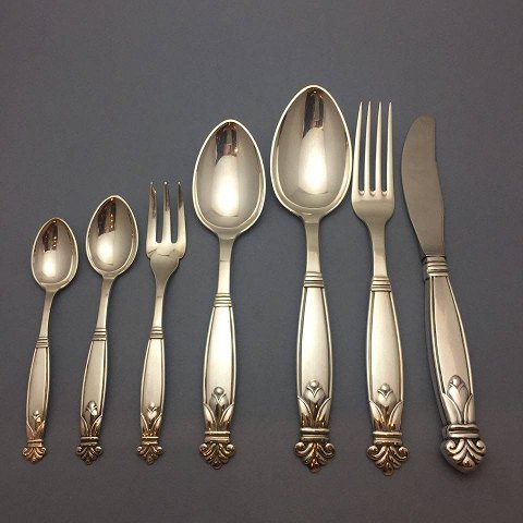 "Gefion". Sølvbestik af tretårnet sølv til 8 personer, i alt 61 dele. Bestående af spisebestik: 8 middagsknive, 8 middagsgafler, 8 spiseskeer, 8 dessertskeer, 8 kagegafler, 8 teskeer, 8 kaffeskeer Serveringsdele: 1 serveringsske, 1 kartoffelske, 1 stegegaffel, 1 sauceske og 1 spade. Udstiller