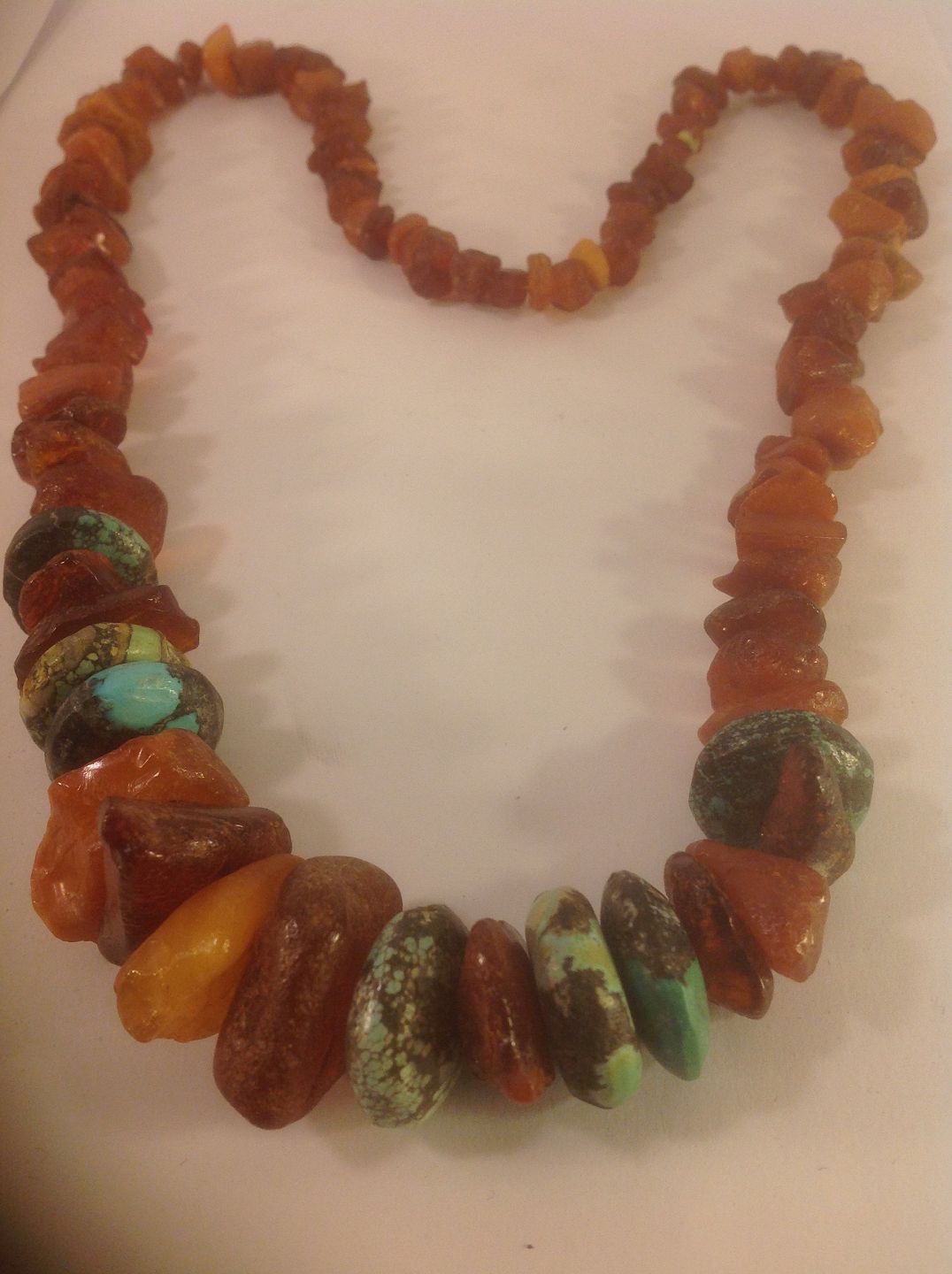 Rav halskæde med Tyrkiser.Længde: 65 cm.