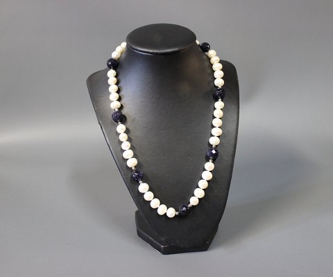 Halskæde med ferskvandsperler og facetslebne blå goldstone perler.Kæden er 52 cm lang.